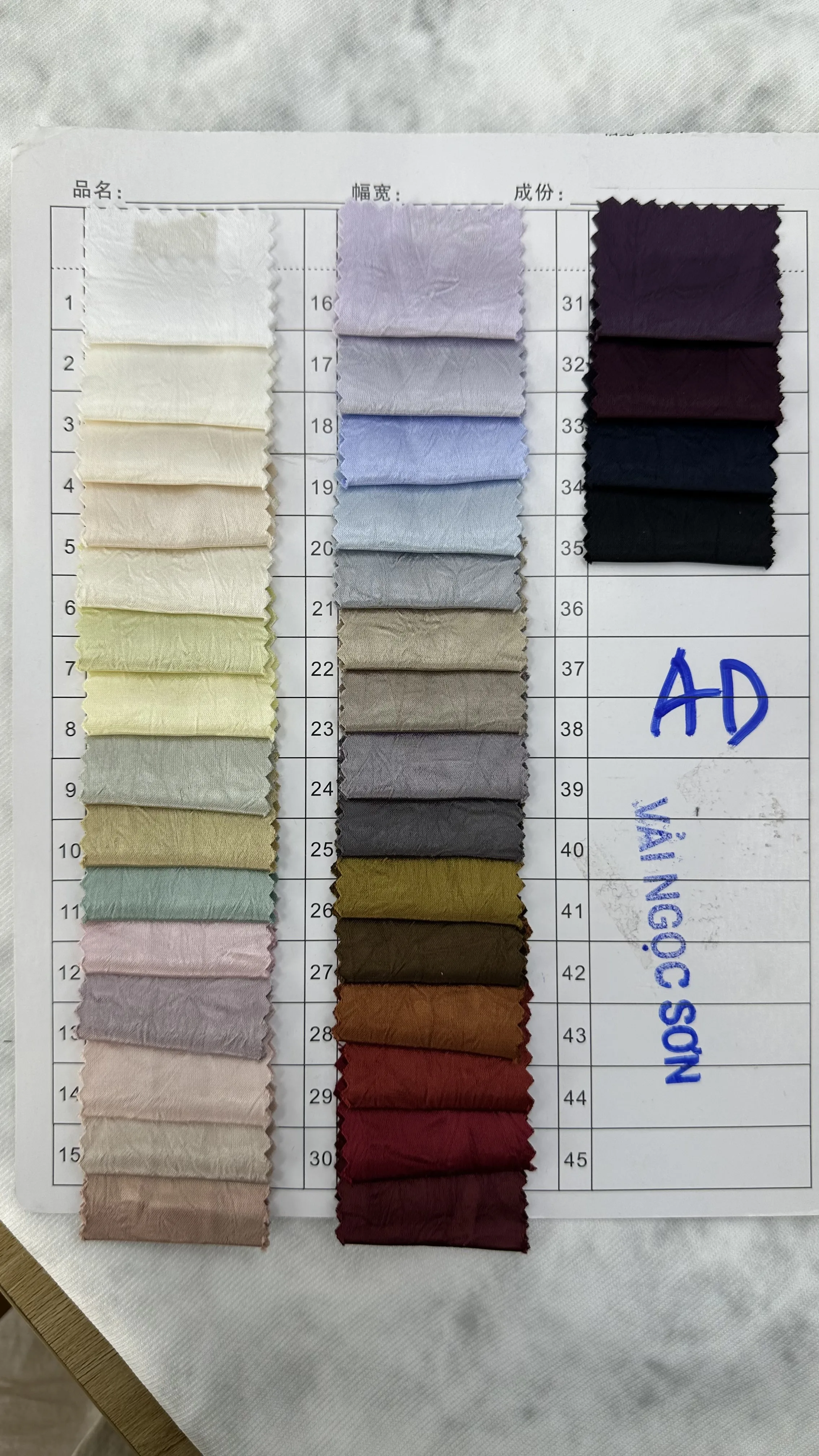 Lụa Trơn/Lụa Viscose Mềm Mại là dòng vải có bề mặt trơn, hơi nhăn nhẹ (hoặc gân/texture mờ), mang lại cảm giác mềm mại, bay bổng và thoáng mát. Chất liệu này có bảng màu phong phú, từ tông pastel nhẹ nhàng đến các tông đậm. Rất thích hợp cho Áo Dài, Áo sơ mi, Váy đầm suông hoặc các thiết kế cần độ rủ cao.