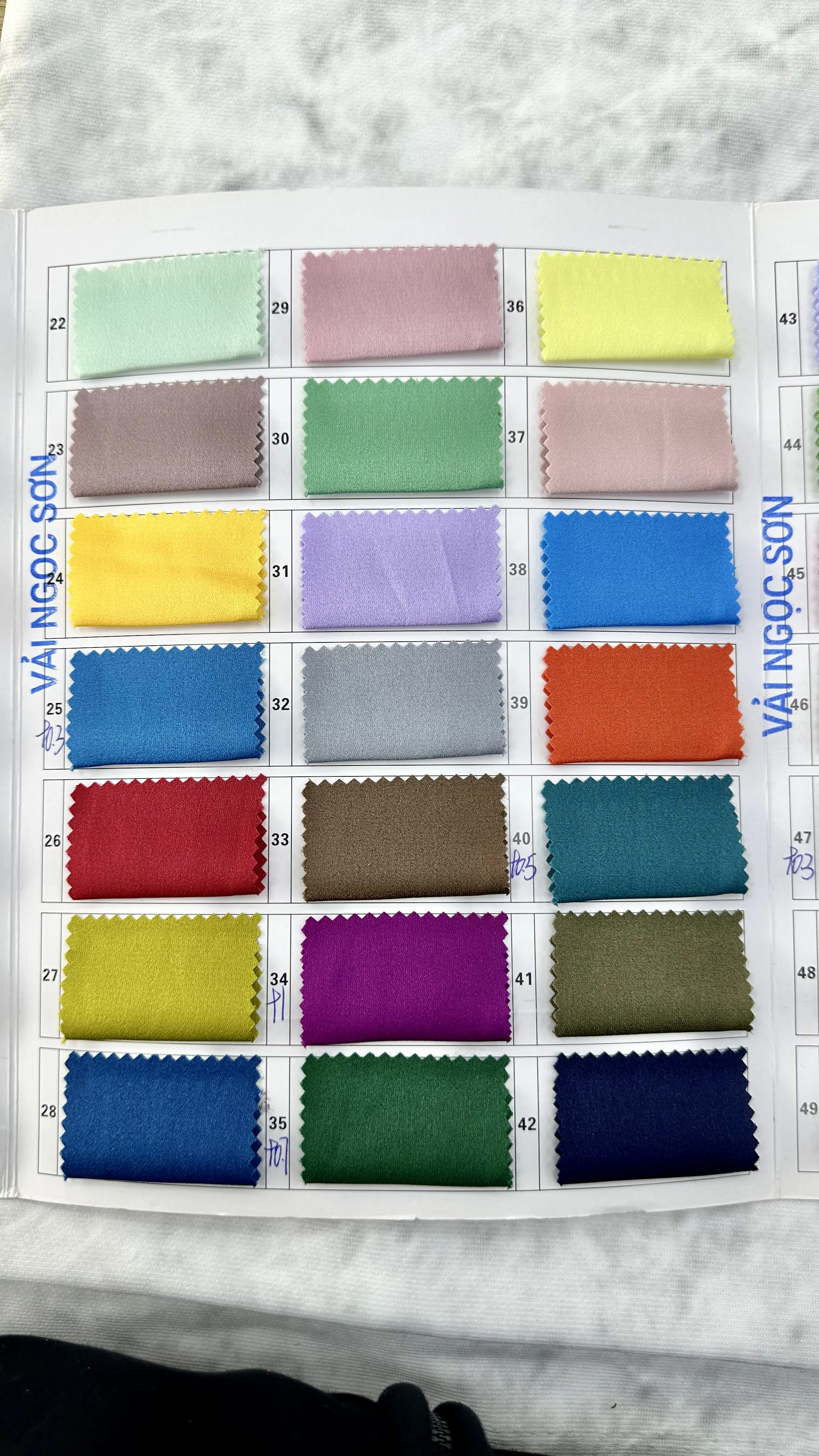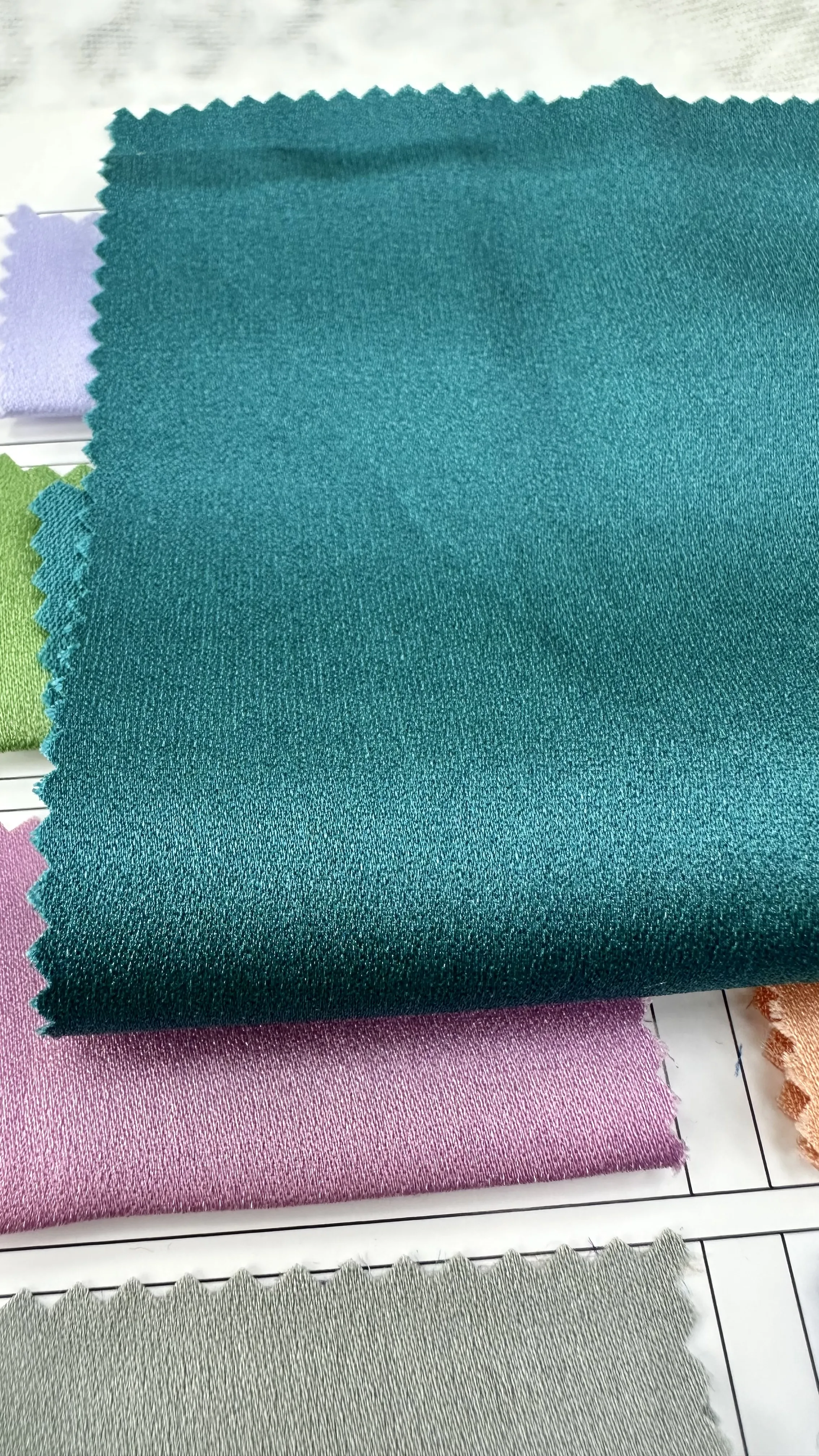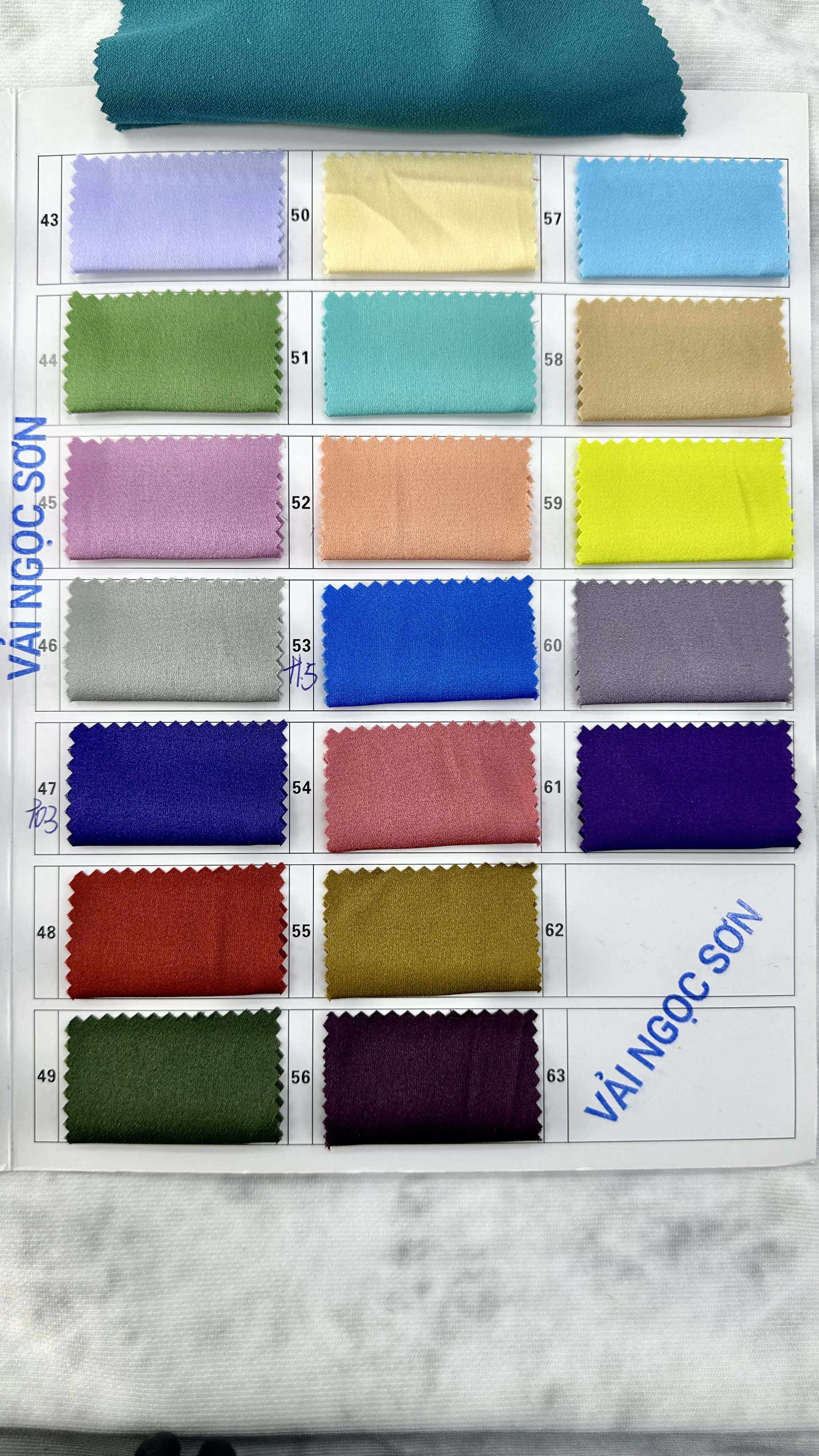 Satin Trơn (Mã: 66557, 43-63): Bề mặt bóng mượt, chất vải mềm mại, không họa tiết, độ rũ nhẹ. Bảng màu phong phú từ tông Pastel, trung tính đến màu rực rỡ. Hoàn hảo để may quần, cổ áo, lót trong hoặc các trang phục cần độ bóng mượt đơn sắc.